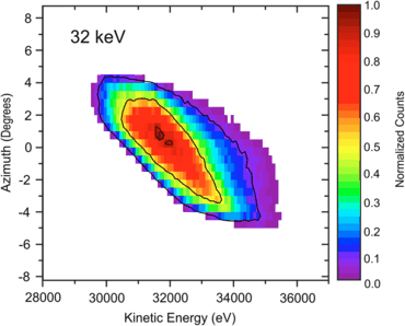 Comparison of the incident ion energy measured at every beam setting with the high resolution ESA micro-stepped voltage scans (Fig. 53) yields a very accurate measurement of the analyzer constant of 5.45 which is within expected error limits (Table 8).