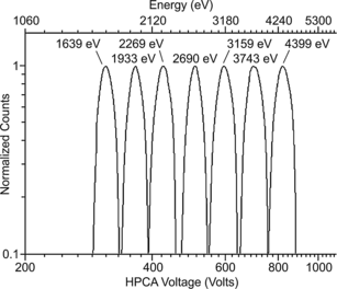 Seven energy passbands covering center energies from 1639 to 4399 eV. The ratio of energy (top scale) to applied voltage on the ESA (bottom scale) gives an analyzer constant of 5.45