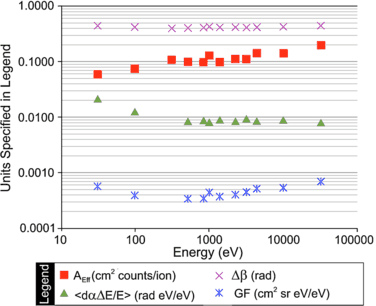 When a parameter had to be characterized across the entire energy range we used a selection of seven logarithmically equal-spaced energy steps separated by a factor of approximately three (Table 7). However it still was not possible to sample all of the measurement space (e.g., all angles) even at these few energies so a single energy of 3.159 keV was chosen for most angle samples because it is in the central part of the energy range where the −15 kV acceleration potential still has some effect on ion trajectories. (At very low energies ion trajectories into the TOFA are entirely dominated by the electric field created by −15 kV, while at the highest energies the field has little effect on trajectories.)