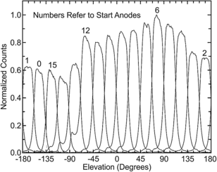 Elevation passbands for each of 16 anodes. Counts are normalized to 1.0. Numbers above some of the passbands refer to start anodes which are referenced to the sensor structure