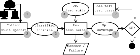 Concerning the costs of the proposed operational coverage, the cost of classifying the entities according to their importance (the first step of our approach) will depend on how the operational profile is derived. For the case advised in Fig. 1 in which the operational profile can be derived from real world usage by monitoring field data, the count spectrum (bullet 3, Fig. 1) required for defining the relevance of the entities might even be readily available, or otherwise can be obtained by using mining techniques to capture the frequencies of the entities being exercised by the users. Regarding the cost of computing the operational coverage itself (bullet 6, Fig. 1), as for any coverage criterion, operational coverage presupposes that the code is instrumented so to allow the identification of the entities exercised. So the cost of applying the operational coverage equation is comparable to any other coverage metric.