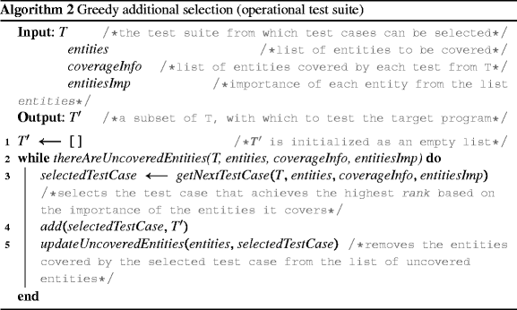 Harder et al. (2003) proposed a specification-based test case selection technique called “operational difference.” Their technique dynamically generates a collection of logical statements (called “operational abstractions”) that abstract the program’s operation based on the execution of test cases. By comparing operational abstractions, their technique can be used for test suite generation, augmentation, and minimization. In our approach, however, we assume that the representation of the expected program’s operation is already available in the form of operational profiles. We classify the code entities according to their importance to the operational profile and use that information to select test cases that would exercise the most relevant entities to that particular profile. Besides that, although the same term of operational coverage is defined in Harder et al., the meaning is different from the one we used here. In (Harder et al. 2003), operational coverage is defined in terms of precision and recall and the term is used to evaluate the quality of an operational abstraction when compared with an oracle or goal specification. In our work, operational coverage is a coverage criterion that can be used for both test adequacy and selection in the context of operational profile-based testing.