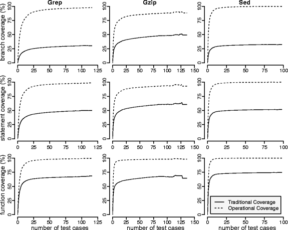 While targeting branch coverage (Fig. 3), the number of test cases in the test suites derived according to the operational coverage approach varied from 1 to 31 for grep, from 2 to 38 for gzip, and from 2 to 21 for sed. For the test suites derived according to traditional coverage, the number of test cases ranged from 29 to 34 for grep, from 30 to 41 for gzip, and from 19 to 22 for sed.