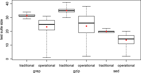 With respect to the statement coverage criterion, displayed in Fig. 4, the average numbers of test cases in the test suites derived for operational coverage were 22.18, 18.79, and 12.01, for grep, gzip, and sed, respectively. For the test suites derived for traditional coverage, the figures were (following the same order) 28.76, 24.85, and 16.18.