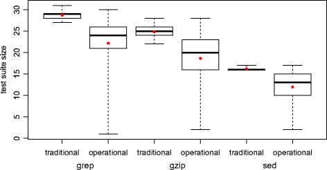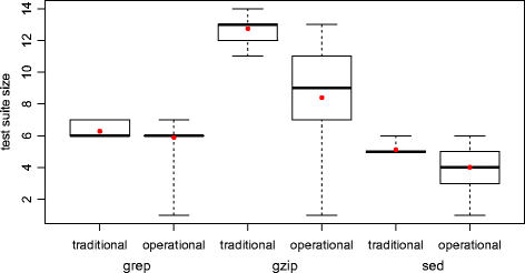 For the test suites generated targeting function coverage (Fig. 5), the average number of test cases required by operational coverage for grep was 6.28, while 6.29 test cases were required for traditional coverage. For gzip, the figures were (following the same order) 8.39 and 12.74. Finally, for sed, the average numbers of test cases required were 4.02 and 5.13.