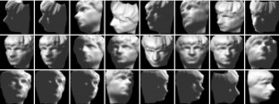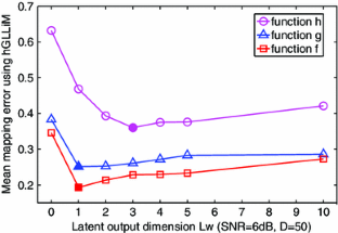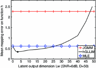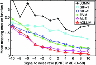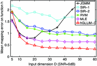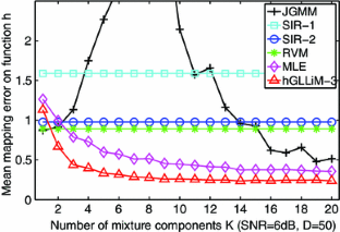 The hybrid nature of hGLLiM (at the crossroads of regression and dimensionality reduction) is striking in this variant, as it alternates between a mixture-of-Gaussians step, a local-linear-regression step and a local-linear-dimensionality-reduction step on residuals. This variant is also much easier to initialize as a set of initial posterior values \(\{r_{nk}^{(0)}\}_{n=1,k=1}^{N,K}\) can be obtained using the \(K\)-means algorithm or the standard GMM-EM algorithm on \({\varvec{t}}_{1:N}\) or on the joint data \([{\varvec{y}};{\varvec{t}}]_{1:N}\) as done in (Qiao and Minematsu 2009) before proceeding to the M-step. On the other hand, due to the time-consuming eigenvalue decomposition needed at each iteration, the marginal hGLLiM-EM turns out to be slower that the general hGLLiM-EM algorithm described in Sect. 5. We thus use the marginal algorithm as an initialization procedure for the general hGLLiM-EM algorithm.