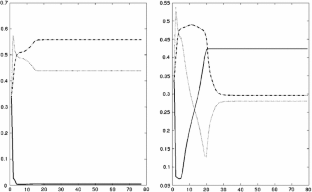 $$\begin{aligned} t_{j\ell }^{(c+1)}= \frac{\rho _{\ell }^{(c)} \phi _{\ell }(\mathbf{y}_{\cdot j};\varvec{\alpha }_{\cdot \ell }^{(c)})}{\sum _{\ell '} \rho _{\ell '}^{(c)} \phi _{\ell '}(\mathbf{y}_{\cdot j};\varvec{\alpha }_{\cdot \ell '}^{(c)}) } , \ell =1,\ldots ,m \end{aligned}$$where \(\mathbf{y}_{\cdot j}\) denotes the column \(j\) of the matrix \(\mathbf{y},\, \varvec{\alpha }_{\cdot \ell }=(\alpha _{1\ell },\ldots ,\alpha _{g\ell })\) and