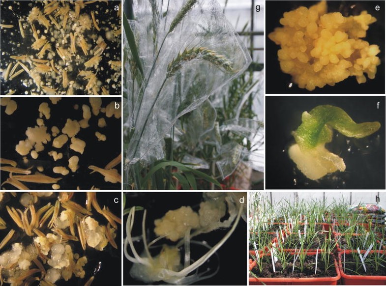 Triticosecale Wittmack cv. Bogo regenerants derived via in vitro culture and their progeny; a androgenesis on liquid induction medium, b embryo formation from shed microspore culture, c androgenesis on solid induction medium, d albino plant derived from anther culture, e somatic embryogenesis from immature zygotic embryo, f germinating embryo, g fertile anther culture-derived plants, h progenies of regenerants