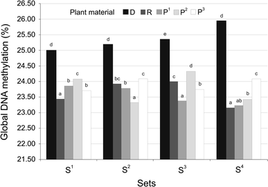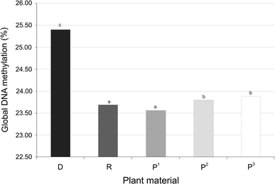 Tukey’s grouping of donors (D), regenerants (R), the first (P 1 ), the second (P 2 ) and the third (P 3 ) generative progeny of the regenerants without considering sets or tissue culture regeneration method, based on global DNA methylation evaluated via RP-HPLC. Global DNA methylation is expressed as the amount of methylated cytosine to the total amount of cytosine converted to percentages. Materials forming the same group are indicated by either ‘a’, ‘b’ or ‘c’ letters