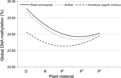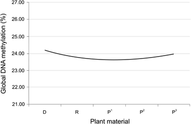 Polynomial regression analysis of global DNA methylation changes exhibited between D, R, P 1 , P 2 and P 3 materials according to the tissue culture regeneration method. The regression line for D–RM–P M 1 –P M 2 –P M 3 , D–RA–P A 1 –P A 2 –P A 3 and D–RE–P E 1 –P E 2 –P E 3 are given in black, dotted and dashed lines, respectively