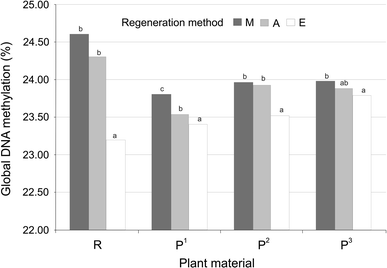 Tukey’s grouping of the regenerants (R), the first (P 1 ), the second (P 2 ) and the third (P 3 ) generative progeny of the regenerants based on tissue culture method used. Grouping is indicated by small letters. The materials with the same letter (e.g. ‘a’) form the same group and are distinct from those classified as ‘b’ within the group of R, P 1 , P 2 and P 3 , respectively. Global DNA methylation is expressed as the amount of methylated cytosine to the total amount of cytosine converted to percentages. The regenerants derived either via M (dark grey), A (grey) or E (white) approach and their progeny are indicated by colours