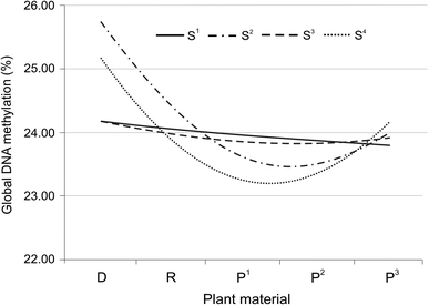 Polynomial regression reflecting global DNA methylation changes among donors (D), regenerants (R), their successive generative progeny (P 1 , P 2 and P 3 ) within each of the S 1 , S 2 , S 3 and S 4 sets