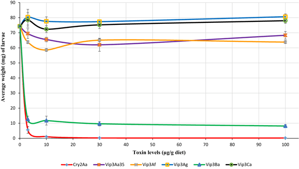 Effect of Vip3 and Cry2Aa proteins on the average weight of surviving Maruca larvae after 10 days on artificial diets containing different levels of toxins. Assays were repeated three times. The data were analysed by ANOVA