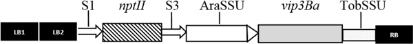 Schematic diagram of the Agrobacterium binary vector T-DNA; LB, RB left and right borders of Agrobacterium T-DNA, respectively. The antibiotic selection gene neomycin phosphotransferase II (nptII) from E. coli was flanked by the S1 promoter derived from segment 1 of the subterranean clover stunt virus (SCSV) genome and segment 3 (S3) 3′ end while the optimized coding region of the vip3Ba gene was flanked by the Arabidopsis thaliana small subunit (AraSSU) promoter and Nicotiana tabacum small subunit (TobSSU) 3′ end