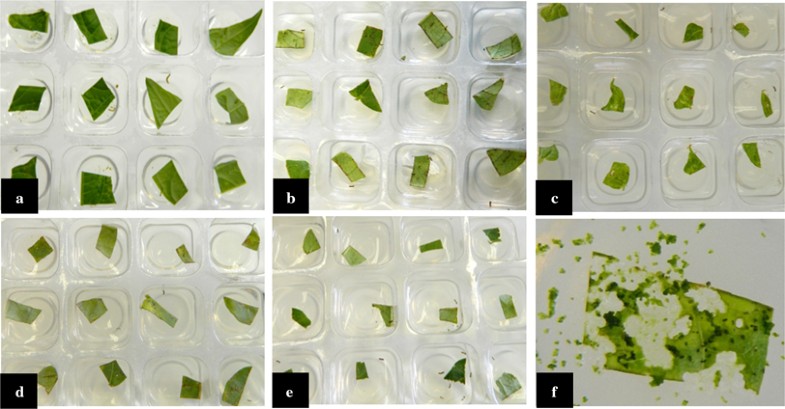 Leaf damage after 10 days of feeding by Maruca larvae on non-transgenic line IT86D and transgenic lines expressing Vip3Ba or Cry 1Ab protein. a Line 709A: (positive control expressing Cry 1Ab protein), b line V24 (425 ng Vip3Ba/mg TSP), c line V25 (155 ng Vip3Ba/mg TSP), d line V43 (895 ng Vip3Ba/mg TSP), e line V87 (365 ng Vip3Ba/mg TSP) and f line IT86D (0 ng Vip3Ba/mg TSP)