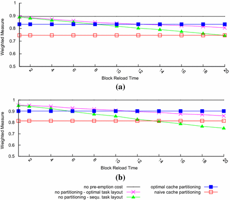 Weighted schedulability measure; varying block reload time from 1 to 20 \(\upmu \)s (assuming constant worst-case execution times). a Fixed priority scheduling, b EDF scheduling