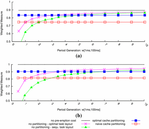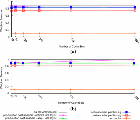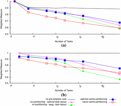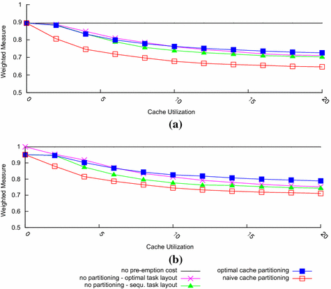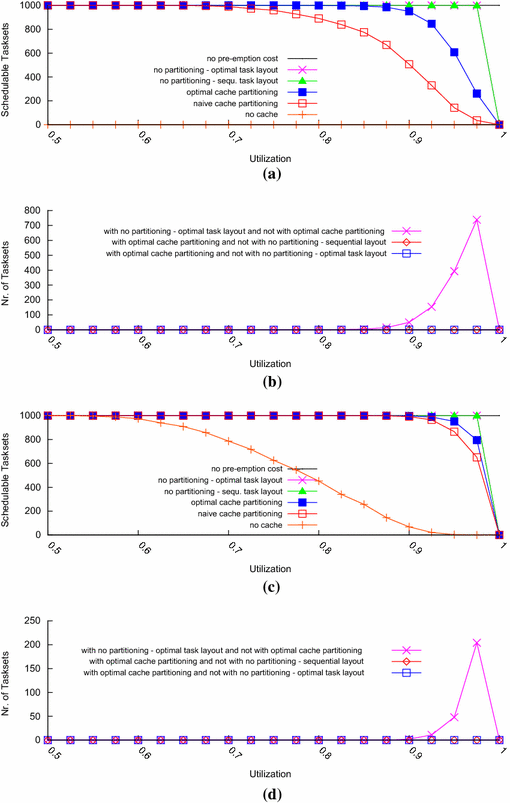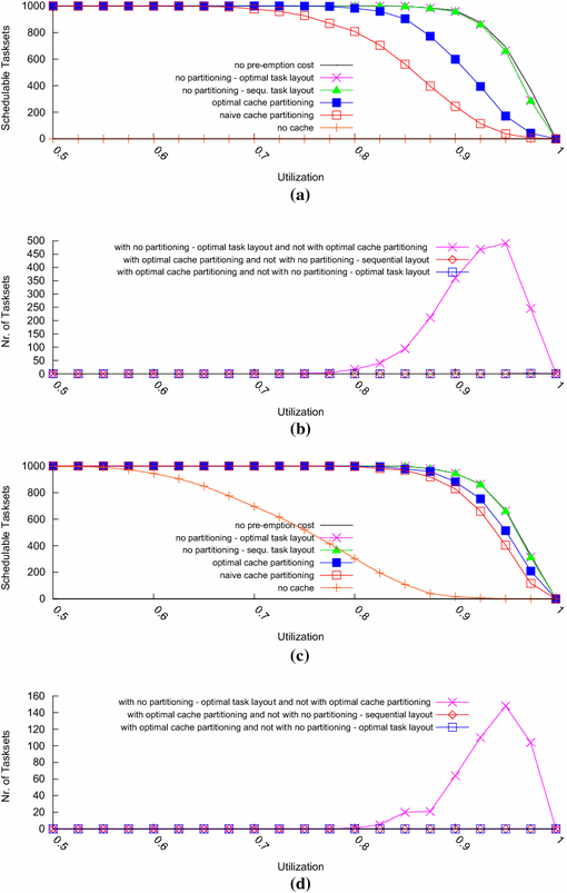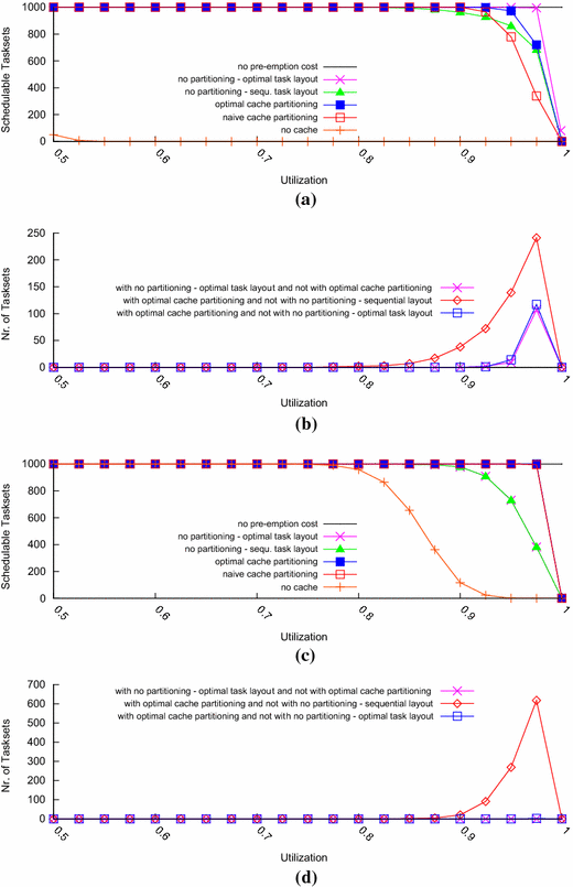 In each experiment the taskset utilization not including pre-emption cost was varied from 0.025 to 0.975 in steps of 0.025. For each utilization value, 1000 tasksets were generated and the schedulability of those tasksets was determined using the cache partitioning algorithms or pre-emption cost aware analysis with either sequential or optimal task layout (Lunniss et al. 2012). We thus compared the results for cache partitioning against those for (i) no partitioning with a sequential task layout, (ii) no partitioning with an optimized task layout, (iii) analysis ignoring pre-emption costs, but assuming that all the tasks shared the cache; (iv) naive cache partitioning with all tasks allocated the same size partition S / n; (v) no cache. The sequential task layout reflects the basic un-optimized cache mapping, i.e., where the code for each task is placed consecutively in memory. In case of unconstrained cache usage, we used the combined multiset approaches for fixed-priority (14) and for EDF scheduling (31) to compute the schedulability of the tasksets.