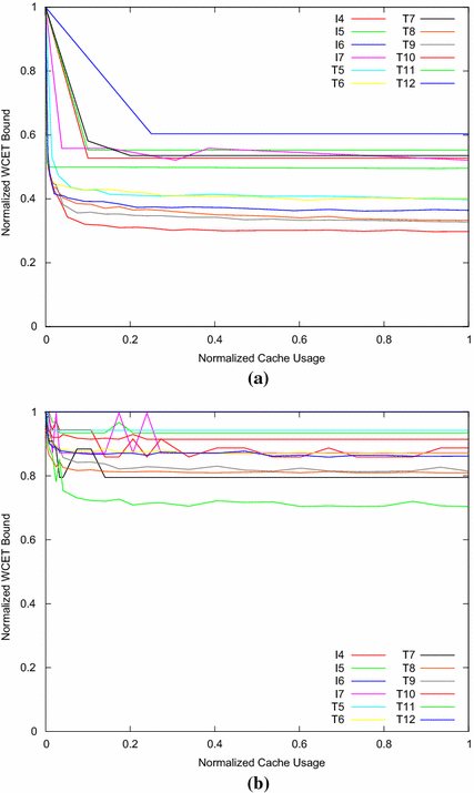 For the case study, the target architecture is an ARM7 processor (with a 4 kB direct-mapped write-through cache, line size of 16 Bytes, 256 cache sets, block reload time 8 \(\upmu \)s, clock rate of 100 MHz). The execution time bounds were derived using the aiT Timing analyzer (Ferdinand and Heckmann 2004). The values are derived from an example configuration of the ARM7 as used in previous work (see Altmeyer et al. 2011).