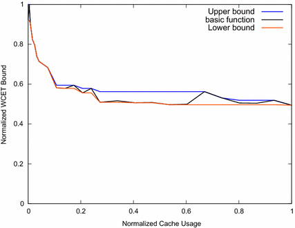 Over-/underapproximations of the WCET function (statemate benchmark, direct mapped data cache, perfect instruction cache)