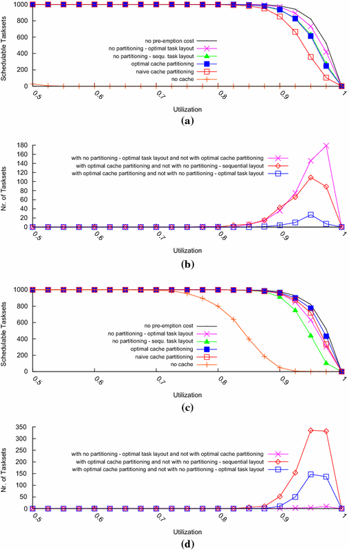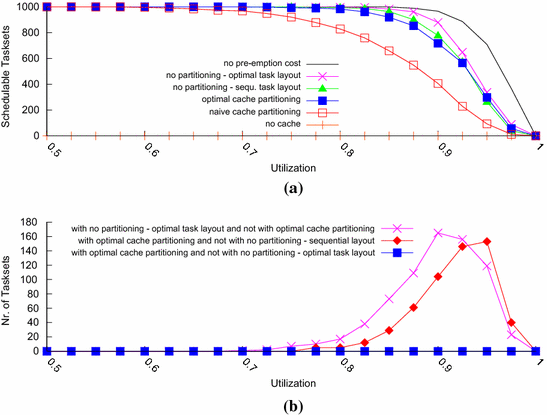 Overall, cache partitioning and pre-emption cost analysis with a sequential, un-optimized task layout have similar performance; however, we note that there are also a large number of tasksets that can only be scheduled with one of the two approaches, but not with the other. This shows that cache partitioning is a viable alternative in some scenarios and detrimental in others. However, we also observe that the optimal task layout with no partitioning has a clear advantage over optimal partitioning in terms of the number of schedulable tasksets (see Figs. 13b and 14b).