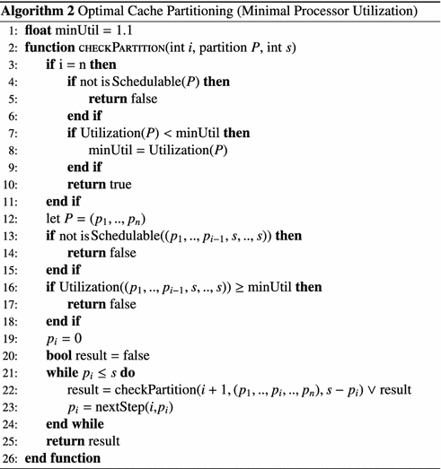 The global variable minUtil is initially set to 1.1 to indicate that no schedulable cache partitioning has been found yet. As soon as the algorithm encounters a schedulable partitioning, the utilization is computed and compared to minUtil (which is updated if necessary).
