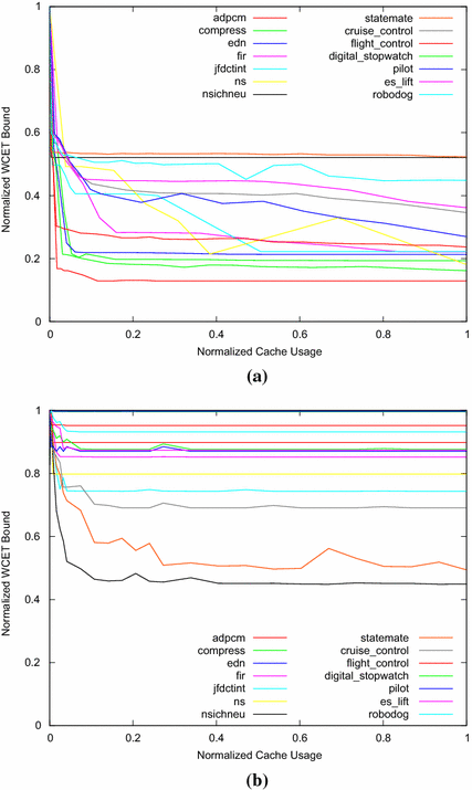 The target architecture is an ARM7 processor3 with direct-mapped cache of size 4 kB with a line size of 16 Bytes (and thus, 256 cache sets), a block reload time of 8 \(\upmu \)s and a clock rate of 100 MHz. The cache uses a write-through policy to enable a constant block reload time, required for the static timing analysis. The values are derived from an example configuration of the ARM7 as used in previous work (see Altmeyer et al. 2011). As benchmarks, we used PapaBench (Nemer et al. 2006) and the Mälardalen benchmark suite (Gustafsson et al. 2010). We used the aiT Timing analyzer (Ferdinand and Heckmann 2004) to compute WCET bounds, and evaluate the sensitivity of execution time with respect to cache partition size.