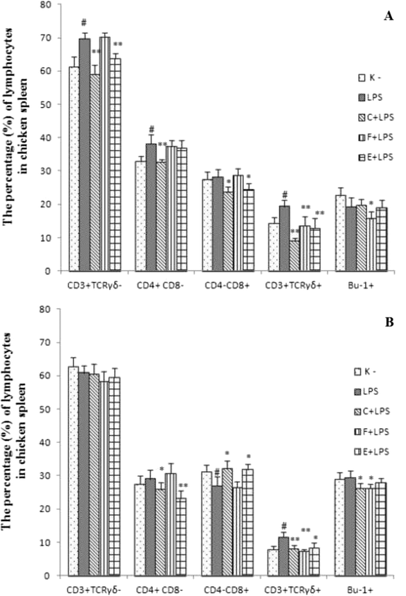 On the 6th d.e. the percentage of CD3+TCRγδ−, CD3+TCRγδ+, CD4+CD8−, CD4−CD8+ decreased in the C+LPS group as compared to the positive control group. Also, a lower percentage of CD3+TCRγδ−, CD4−CD8+ and CD3+TCRγδ+ in the E+LPS group was demonstrated in comparison to the positive LPS control group. A decreased percentage of CD3+TCRγδ+cells and Bu-1+ was found in the F+LPS group as compared to the LPS group (Fig. 2a).