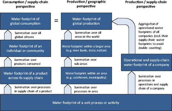 The relation between different water footprints. Water footprints of single processes or activities form the basic building blocks for the water footprint of a product, consumer, or producer or for the footprint within a certain geographical area. The footprint of global consumption is equal to the footprint of global production (adapted from Hoekstra et al. 2011)