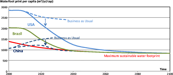 Hypothetical convergence of the WF of national consumption of different countries towards an equal share in the maximum sustainable global WF. The maximum sustainable global WF per capita will decline due to population growth (UN medium scenario). Water-use efficiencies need to be improved beyond what is expected under a Business as Usual scenario, and consumption patterns will need to become aligned to what is possible within the planetary boundaries for freshwater supply. Data for 2000 from Hoekstra and Mekonnen (2012)