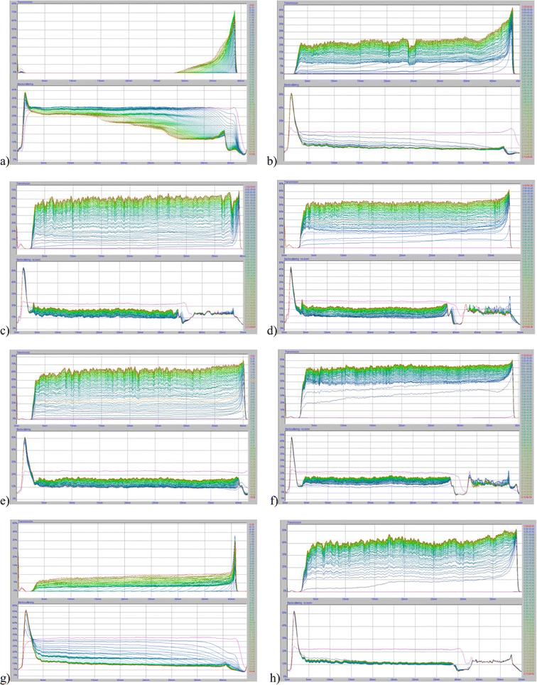 Transmission and backscatter curves for the systems: a Cr2O3 at pH 3, b Cr2O3–EPS at pH 3, c Cr2O3 at pH 4.6, d Cr2O3–EPS at pH 4.6, e Cr2O3 at pH 7.6, f Cr2O3–EPS at pH 7.6, g Cr2O3 at pH 9, h Cr2O3–EPS at pH 9. C EPS = 1 ppm, C NaCl = 0.01 M