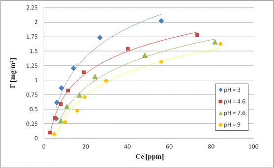 At pH 4.6 the amount of adsorbed bacterial polysaccharide is less than at pH 3. Under these conditions electrostatic adsorbent–adsorbate attraction is weaker due to the lower density of solid surface charge. Furthermore, at pH 4.6 EPS dissociation degree (α) is 0.86, which means that undissociated carboxylic groups number in the polysaccharide macromolecules is small. The advantage of COO− groups in the polymer segments contributes to their mutual repulsion, which causes polysaccharide macromolecule expansion. Adsorption of these polymer chains is equivalent to the blocking of active sites on the adsorbent surface resulting in the decreasing of the EPS adsorption level.