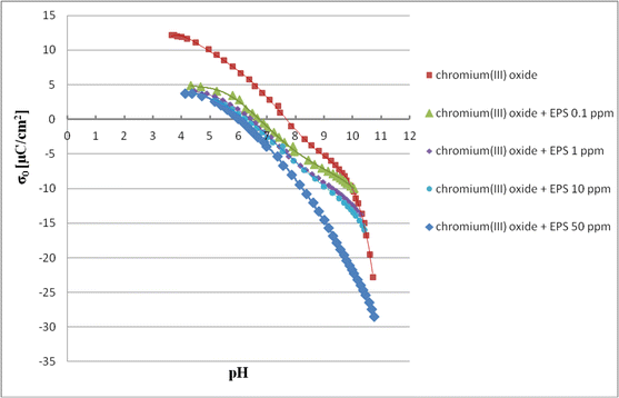 At first the supporting electrolyte (0.01 M NaCl) solution and the S. meliloti 1021 EPS solution with the concentration of 1 ppm were titrated. Next, the titrations of chromium(III) oxide suspension in the presence and absence of the bacterial polymer were conducted. To prepare suspensions 1.5 g metal oxide was used. EPS concentration in the examined suspensions was equal to 0.1, 1, 10 or 50 ppm. All systems were titrated with the 0.1 M NaOH solution.