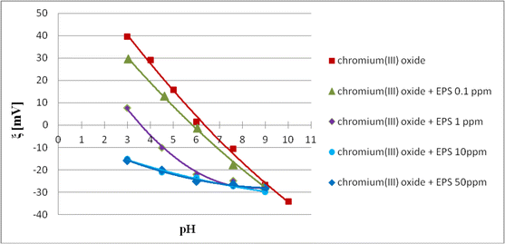 Electrokinetic potential measurement started with the preparation of 500 ml chromium(III) oxide suspension by adding 0.03 g of solid to the solution containing 0.01 M supporting electrolyte (NaCl) and appropriate EPS amount giving its final concentration of 0.1, 1, 10 or 50 ppm. After 3-min sonication suspensions were poured into five Erlenmeyer flasks and their pH values were adjusted to 3, 4.6, 6, 7.6 and 9 ± 0.05. Then the zeta potential was measured using Zetasizer 3000 (Malvern Instruments); the apparatus was washed twice before each measurement. One result was the average of five measurements. The measurement error did not exceed 5 %.