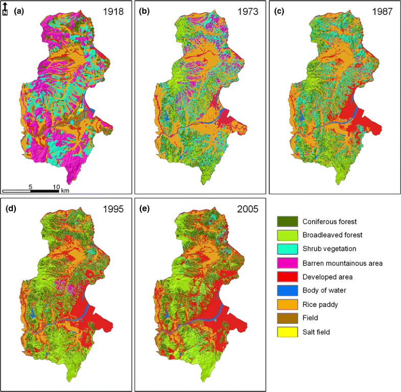 To quantify the effect of the restoration project at the landscape level, we clarified landscape change over the course of 90 years by interpreting a topographical map from 1918 scaled at 1:50,000 (published by the Japanese Government-General of the Joseon Dynasty) and four satellite images taken in 1973, 1987, 1995, and 2005. To apply modern analysis to the map, we divided the land cover using a digitizing method according to the symbols representing nine land cover classes: broadleaved forest, coniferous forest, low vegetation, barren mountainous area, developed area, water body, rice paddy, field, and salt field. The five separately constructed digital polygon maps were compiled into a master vector data layer and converted to grid form (pixel size 30 m × 30 m).