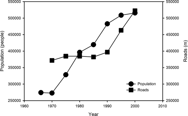 The developed area, including industrial complexes and residential areas, also rapidly increased (Figs. 2, 3). One of the consequences of urbanization is that the development of the city encroaches upon agricultural land. Conversion of agricultural areas from conventional rice paddies and fields to modernized operations using greenhouses was a significant change in Asian countries (Cho 2005b; Li et al. 2005; Tan et al. 2005). The increase in urbanized area corresponds to regional population growth, which increases the need for industrial and residential areas and roads. The increased increment of the urbanized area was consistent with increases in modern agricultural fields and broadleaved forest cover in given landscape. In the past, agricultural landscape elements functioned as a buffer zone, preventing natural landscape elements from becoming isolated by diminishing the strong contrast between vegetated areas and urbanized areas. Conversion of traditional agriculture approaches (rice paddies) to modern ones (greenhouses), however, removed multifunctional characteristics of cultural agriculture (Lee and You 2001; Lankoski 2003).