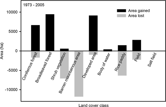 Area lost and gained (i.e., gross change) according to land cover class from 1973 to 2005 in Pohang. Barren mountainous area, areas of shrub vegetation, and rice paddies declined a great deal in area, but forest vegetation such as coniferous and broadleaved forest increased