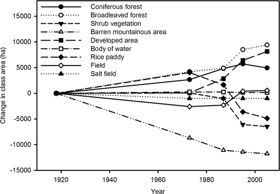 The land cover data of each image was produced using an unsupervised classification method. We extracted each land cover class by comparing already-classified images with original images and combined them into a single grid file using the ‘over’ function of Arcgis 8.3. We calculated the change in each individual land cover class during the 90-year period based on the total changed area during each period as follows: Total changed area = (AreaΔ 1918–1973) + (AreaΔ 1973–1987) + (AreaΔ 1987–1995) + (Area 1995–2005). The cumulative net area changed was estimated from the area gained minus the area lost. This procedure was conducted by Land Change Modeler in IDRISI Andes 15.0.