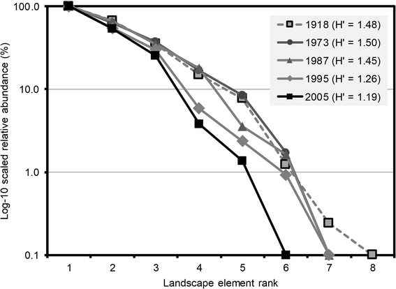 Landscape diversity was analyzed by applying Shannon’s diversity index (H′) (Shannon 1948) and landscape element rank-abundance curves, similar to the species rank-abundance curve (Magurran 2004). The area of each landscape element was used to calculate diversity. Before analysis, coniferous and summer-green broadleaved forests were combined as a single element (forest), and field and paddy fields were combined (field).