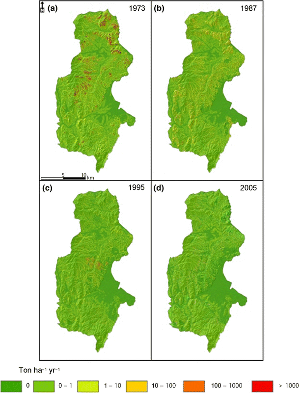 | Soil loss class (ton ha−1 year−1) | 1973 | 1987 | 1995 | 2005 | ||||