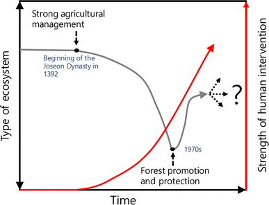 The landscape of South Korea has been changed and dominated by anthropogenic activities, making natural areas and processes are rare. There are various perspectives on the condition and dynamics of ecosystems in South Korea (i.e., the degree to which the ecosystems are degraded or altered; see Hobbs 2016). As mentioned, the landscape was degraded by overexploitation in the early and middle 20th century (Lee and Suh 2005). The historical landscape included forests, grasslands, shrub vegetation, and wildlife populations that supported apex consumers such as tiger, wolf, and fox (NIBR 2013; Ulsan Daegok Museum 2016; Kim 2017). A mixed vegetation landscape was sustained during the Joseon Dynasty (1392–1896) and Daehan-Jeguk Empire (1897–1910) but was almost completely converted into forest by the change in natural resources management policy in the 1970s. Grass and shrublands mainly created by slash-and-burn farming in low-elevation areas were managed by local people, providing essential food, fuel, and opportunities to raise livestock during the Joseon Dynasty period (Kang 2013; Kim 2017).