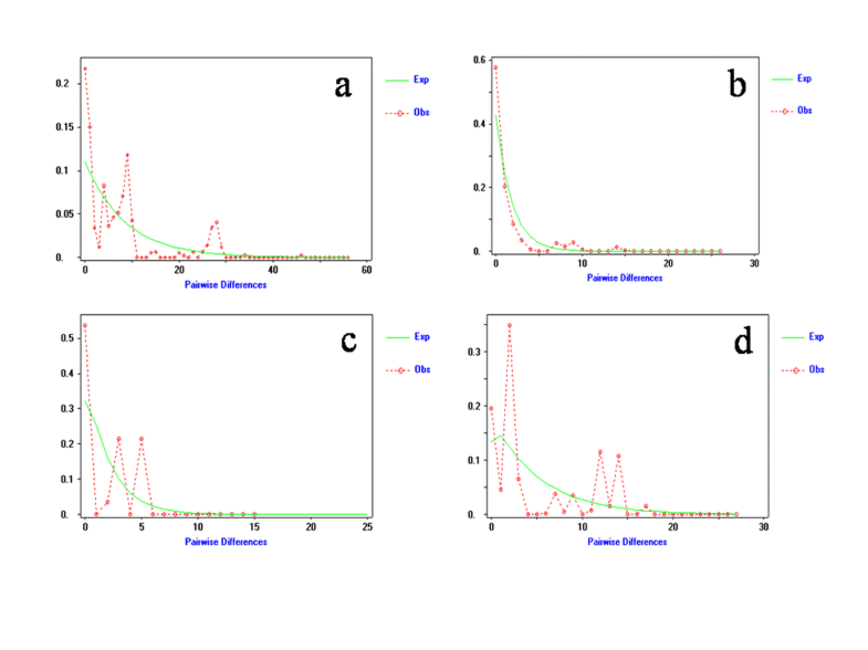 a–d Mismatch distribution for three groups and all populations of Ulmus lamellosa. The thin represents the expectation; The dotted line represents the observed value (GIF 50 kb)