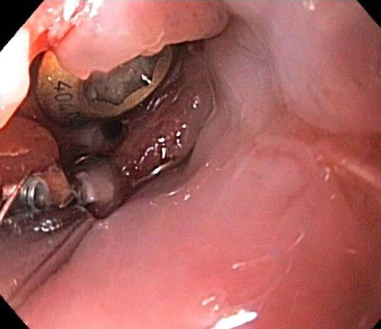 Was es damit auf sich hatte, zeigte schließlich die Ösophagoskopie: Ein metallischer Fremdkörper hatte sich durch die Speiseröhrenwand gedrückt und zu Schleimhautschwellung, Schmerzen und Schluckbeschwerden des Mannes geführt (Abb. 1). Ein CT bestätigte dies — hier war die Abhebung einer Metallplatte mit herausragender Spitze erkennbar.