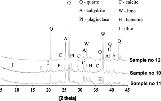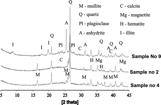 As far as the class of ashes is concerned, materials from bituminous coal combustion (except samples 8 and 9) can be classified as Class F (SiO2 + Al2O3 + Fe2O2 > 70 %) according to The American Society for Testing and Materials (ASTM) (Blissett and Rowson 2012). Sample 9 has a very high content of unburned coal (>25 %) and LOI (28 %), while sample 8 slightly too high LOI (>12 %), which exclude these materials from this category. Very high unburned carbon in sample 9 is most likely due to the coal burning conditions, which evaluation is beyond scope of this paper. Based on the same classification (by ASTM), ashes from lignite coals (samples 10–12) are Class C (SiO2 + Al2O3 + Fe2O2 in the range of 50–70 %).