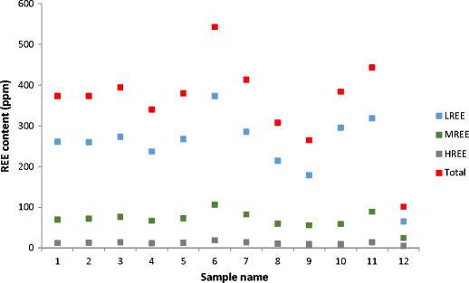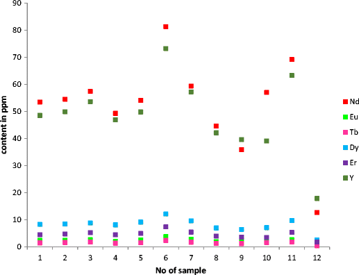 In natural environment, REE are a group of elements with a high potential as process indicators in the system rock or soil as well as water (Grawunder et al. 2014). They can be classified (geochemically) into the following: light earth elements (LREE — La, Ce, Pr, Nd and Sm), medium (MREE — Eu, Gd, Tb, Dy and Y) and heavy (HREE — Ho, Er, Tm, Yb and Lu) (Blissett et al. 2014). However, Seredin and Dai (2012) devised a new REE classification which takes into account current market trends and is related to the likely supply and demand forecast over next few years. This classification divides REE into three groups: critical (Nd, Eu, Tb, Dy, Y and Er), uncritical (La, Pr, Sm and Gd) and excessive (Ce, Ho, Tm, Yb and Lu). Naturally, this classification makes an evaluation of the REE distribution more relevant to the industry (Blissett et al. 2014). It needs to be noted that the commercial importance of REE is not reflected in the amount in which they are used, but in the fact that they are crucial in a wide range of applications including key technologies for the clean and sustainable energy (Alonso et al. 2012; Du and Greadel 2013; Seredin et al. 2013). REE resources are not that rare (deposits have been identified in 34 countries—according to Chen (2011)), but because their mining and production are not cheap and can be associated with significant environmental impact (radioactivity of elements associated with them—uranium and thorium as reported by BGS-NERC 2010), they have low substitution and low recycling rates, most of world’s economies/countries including the European Union (EU) depend highly on the import (Massari and Rubeti 2013). In recent years, majority of countries which produce and export REE, have reduced their export to the EU in order to protect their national downstream industries. For example China, which is world’s main producer and exporter of REE (c.a. 97–98 %) has progressively increased export taxes on them and restricted their export rates (a decrease of about 40 % between 2009 and 2010) (Alonso et al. 2012; Massari and Ruberti 2013). As there is a gap between REE’s growing demand and decreasing supply, it is extremely important to look for the alternative resources.