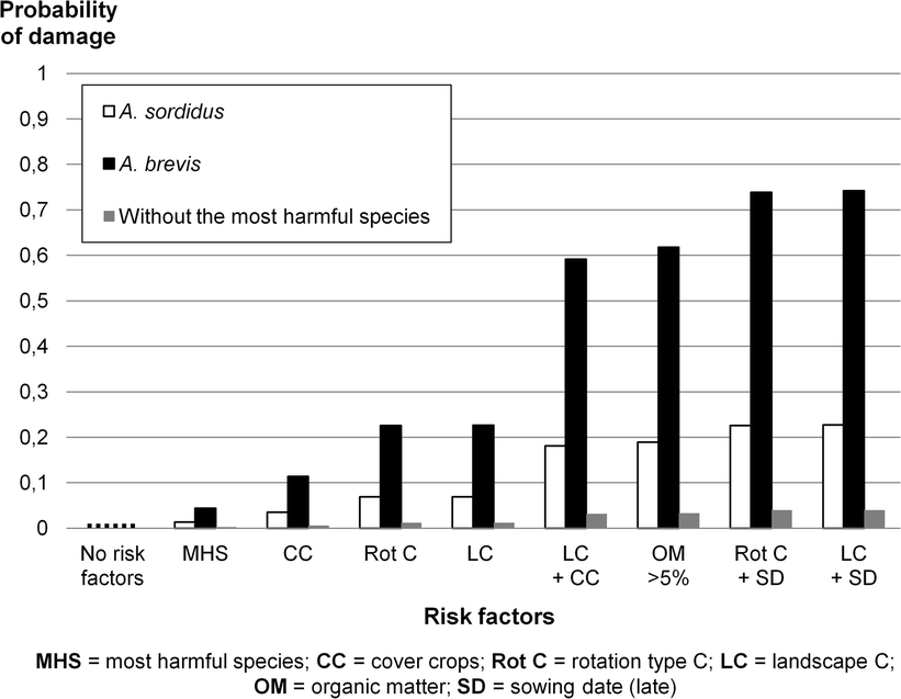Multivariate analysis of factors highlighted some change in the estimation of risk ratios for the independent contribution by variables included in the final model: RR of sowing date and cover crops decreased from 5.22 to 3.27 and from 3.49 to 2.60, respectively. Both factors were on the limit of statistical significance. The strongest factors (P < 0.001) were the following: A. brevis as the prevalent damaging species (RR from 14.36 to 18.51), OM (RR from 31.94 to 14.13), Rot C (RR from 8.57 to 5.16), A. sordidus as the prevalent damaging species (RR from 4.34 to 5.70) and landscape LC (others—LC) with RR increased from 2.06 to 5.18. All the other factors had no significant effects on wireworm damage risk.