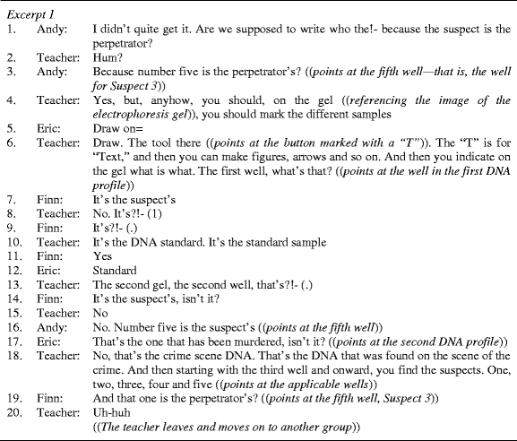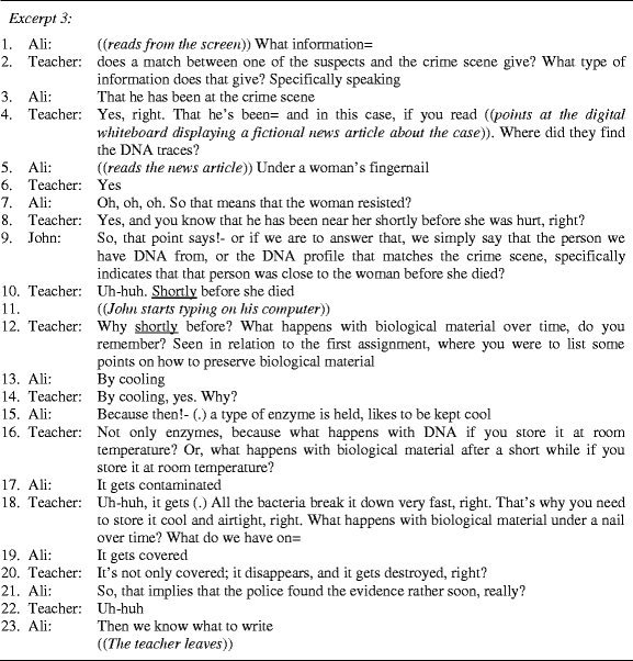 Summing up, the analysis of Excerpt 3 shows that the students struggled to make sense of the assignment and to identify relevant information. The teacher addressed the students’ challenges by reformulating the assignment, by guiding them on where to find relevant information and by directing their conceptual attention through prompting cued questions and providing elaborations. As shown by the analyses of the two previous excerpts, the teacher tried the eliciting strategy of prompting cued questions without much success. Upon realizing that the cued question strategy did not provide sufficient support, the teacher provided detailed explanations about the conceptual issues raised by the students. In the setting presented in Excerpt 3, however, the teacher was more successful in using the cued question eliciting strategy. In this setting, his way of prompting cued questions enabled the students to participate in shared reasoning and to contextualize and see the relevance of the undertaken DNA-analysis experiment.