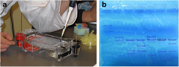 a Student inserting DNA samples in the gel. b The gel product displaying DNA patterns