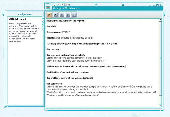 In the final activity, the students were to present their findings in an “official report” addressed to the fictive general attorney, which would be used as the evidential foundation for a court trial. The main intention behind the assignment and the designated support tool was to help students contextualize and see the relevance of the undertaken gel electrophoresis experiment. As forensic experts, the students were instructed to confine themselves to unbiased observations and reliable conclusions. To write the report, the students needed to incorporate the contextual and scientific information both provided and retrieved during the pre-experimental phase. The students were asked to write their report in the designated support tool in SCY-Lab (see Fig. 4).