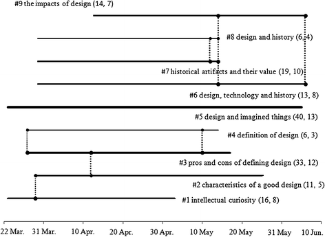 All computer notes except the portfolio notes (148 notes) were put into inquiry threads after thematic analysis. An inquiry thread is a conceptual thread of notes that aims to address the same principal problem (Zhang et al. 2007). Inquiry thread analysis is a way of reconstructing the original conversation threads to understand what students, as a community, are trying to achieve and to identify the inquiry topics that students are discussing. To check the coding reliability of the inquiry thread analysis, two raters independently carried out the same process of analysis with 40 % of the notes. They independently identified the principal problems (e.g., intellectual curiosity, characteristics of a good design), and clustered the notes under these principal problems. The inter-rater reliability was .80 (Cohen’s kappa). We further classified the discourse in the inquiry threads using a coding scheme developed by van Aalst (2009), which distinguishes between three types of discourse: knowledge sharing, knowledge construction, and knowledge building/creation. Knowledge sharing involves the accumulation of ideas without reaching agreement or solving problems. Knowledge construction is the development of explanations by means of problem solving, and involves constructive use of information, questions, and explanations, and the co-construction of ideas in problem solving. Knowledge creation/building threads reflect emergent inquiry questions, emerging knowledge creation with meta-discourse, and awareness of community dynamics with reference notes. In the knowledge-building threads, the ideas are substantially improved. Two coders independently classified all of the inquiry threads, obtaining an inter-rater reliability of .77 (Cohen’s kappa).