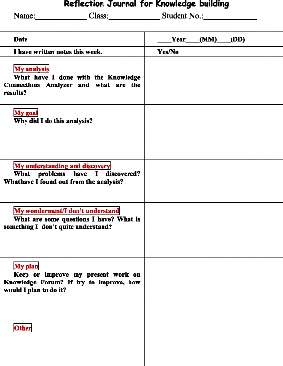 These comprised the Knowledge Forum database, the students’ prompt sheets, and the results of the students’ the KCA analysis. In 2.5 months, the students wrote 161 computer notes, including 13 portfolio notes. The students’ prompt sheets that we designed comprised reflective journal prompt sheets (Appendix A) and the KCA prompt sheets (Appendix B). The latter were used to record the students’ multiple sets of KCA results, their interpretations of and reflections on the data, and their action planning. To enhance the students’ metacognitive activities and thinking, we provided students a reflective journal prompt that included a set of metacognitive prompts, such as “My Analysis,” “My Motivation,” “My Problem,” and “My Plan.” We also provided students the KCA prompt sheets that provided a set of content-related and metacognitive prompts for each of the four questions in the KCA. The prompt sheets were designed to help the students to make sense of the quantitative data generated by the KCA, and to encourage them to engage in metacognitive activities (e.g., monitoring, reflection, and regulation). Together, these prompts formed a metacognitive model that fostered the students’ engagement in a series of metacognitive activities, such as conducting self-or peer assessment, writing reflections, establishing learning goals, and continuously improving their work. The KCA prompt sheets were distributed to the participating students in each lesson, and collected a week later. Some of the students finished their reflection journals and prompt sheets in class, while others completed these tasks after class.